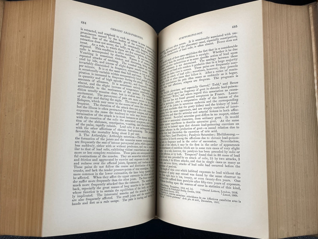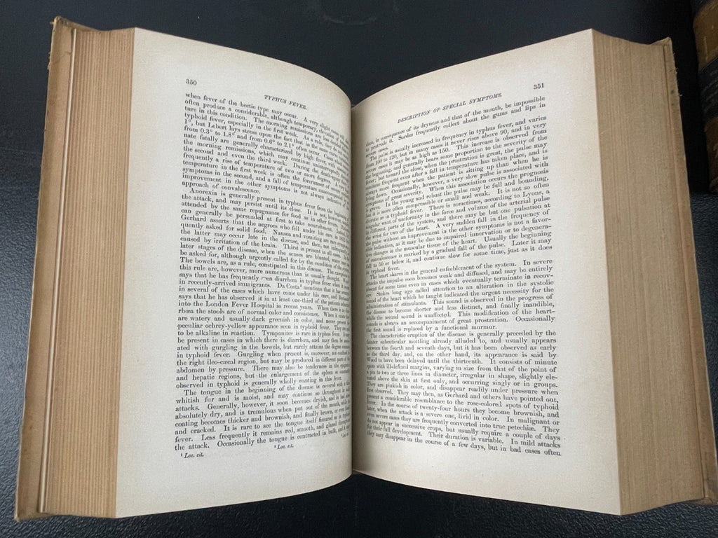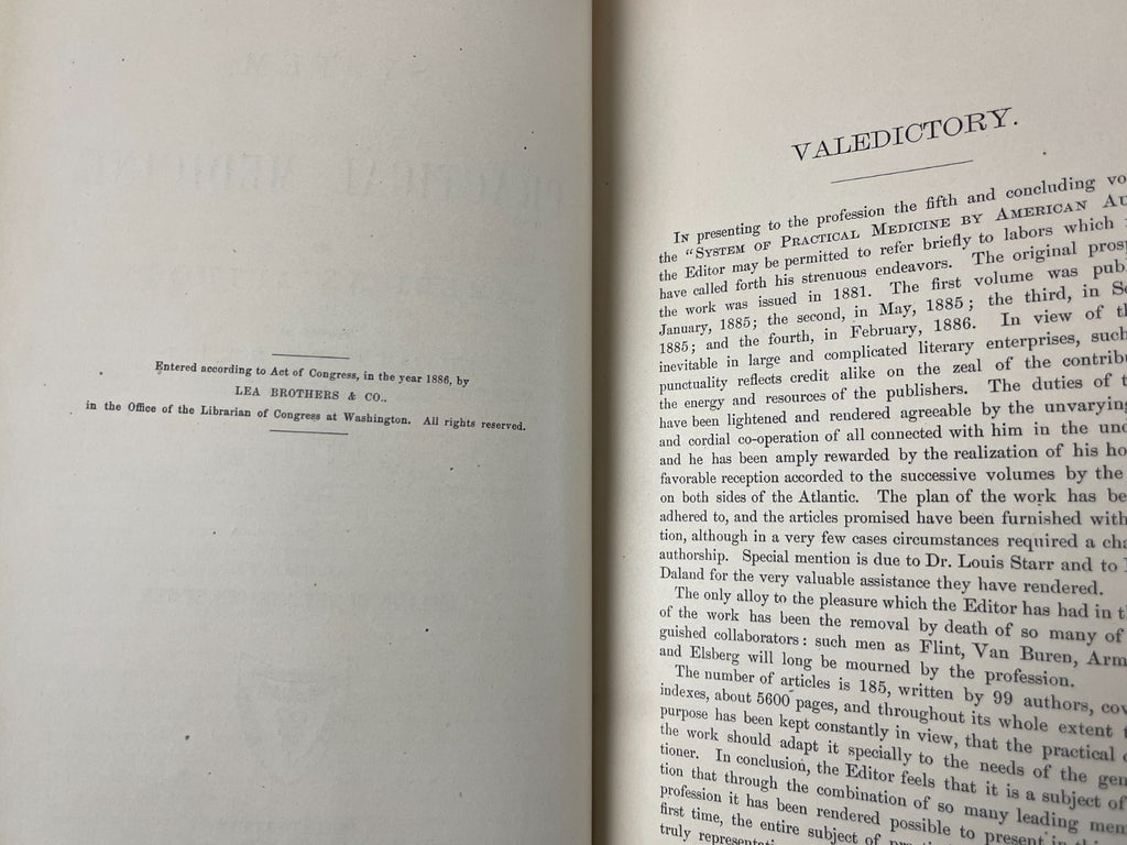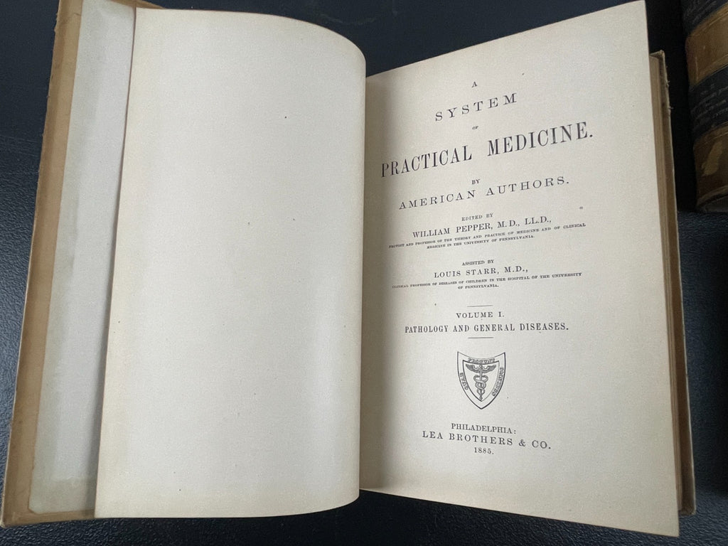 A System of Practical Medicine; William Pepper and various American authors including William Osler; Lea Brothers & Company, Philadelphia; first edition, Vols. 1-3 published in 1885 - Vols. 4 & 5 published in 1886; leather bound, V1-1094 pages, V2-1312 pages, V3-1032 pages, V4-877 pages, V5-1326 pages + advertising section.