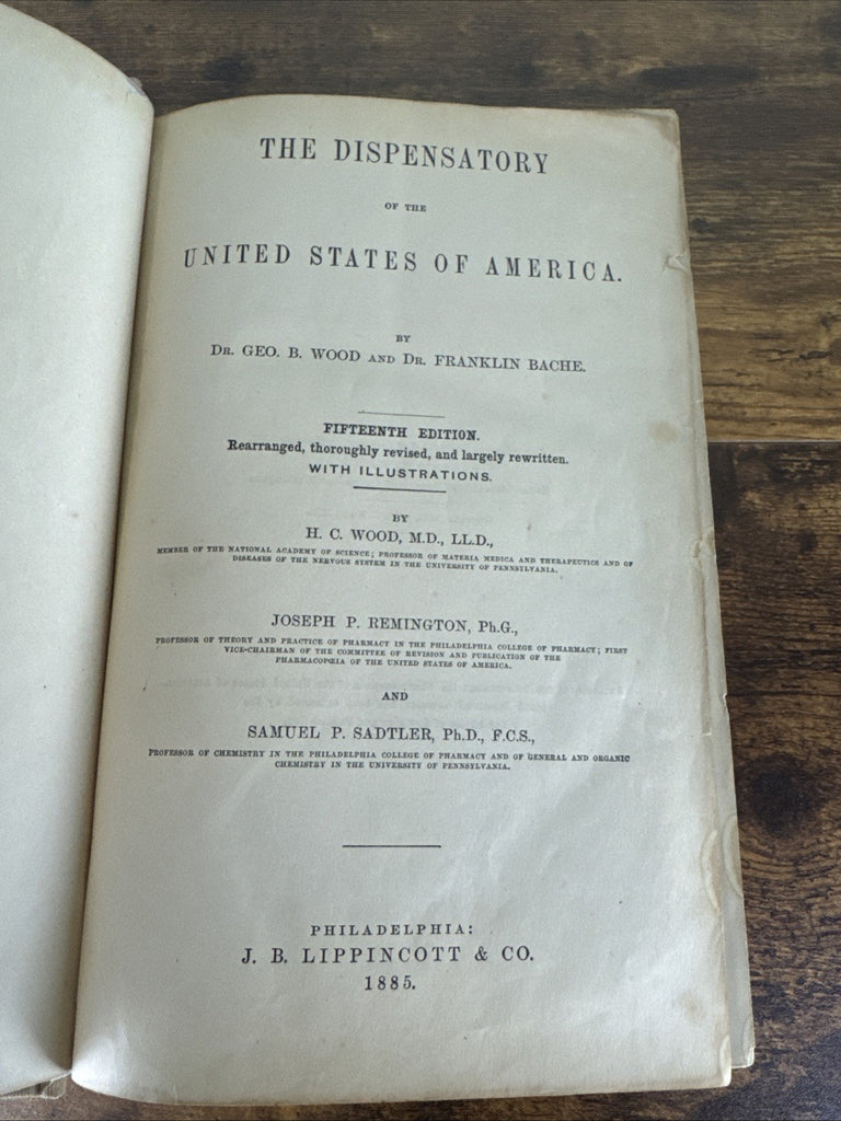 Binding Hardcover, Philadelphia, J. B. Lippincott & Co., Year Printed 1885, Rebound, 15th Edition, Author - H. C. Wood, Joseph Remington, & Samuel Sadtler
