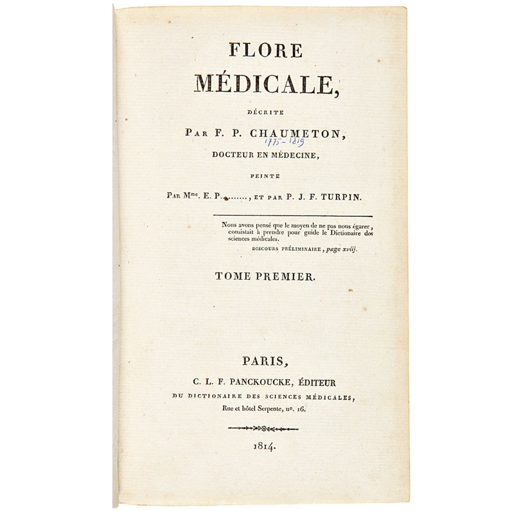 A most important early 19th century compendiums of paintings of known medicinal plants, engraved & colored in the fine stipple-engraved color illustrations in the style of Redouté by two of his most accomplished pupils, Pierre-Jean-François Turpin (1775-1840) and A.E. Panckoucke.