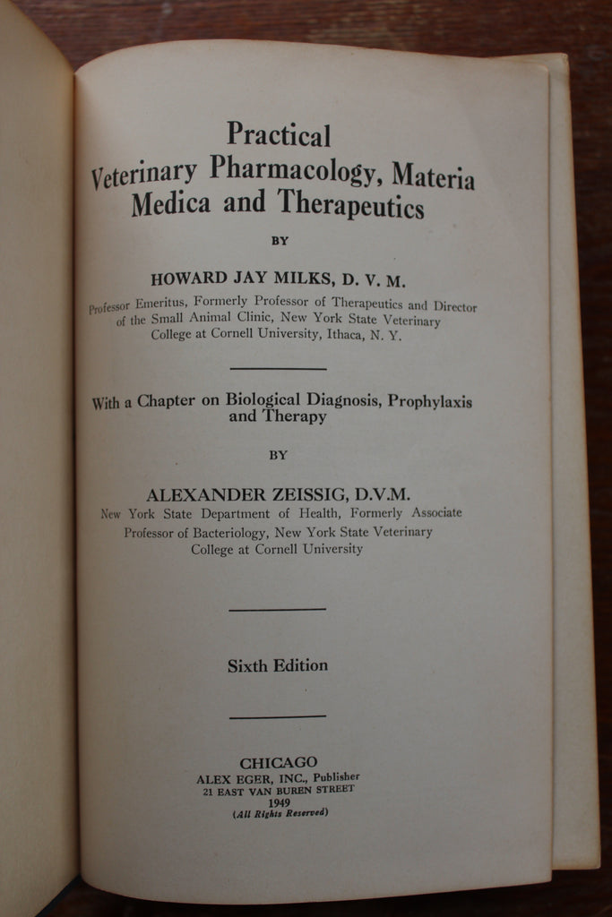 Veterinary Pharmacology Materia Medica Therapeutics. H J Milk. 1949. 6th Ed., Chicago, 6th edition, 720 pages, Some minor check marks in pencil, Overall Very Good Condition.