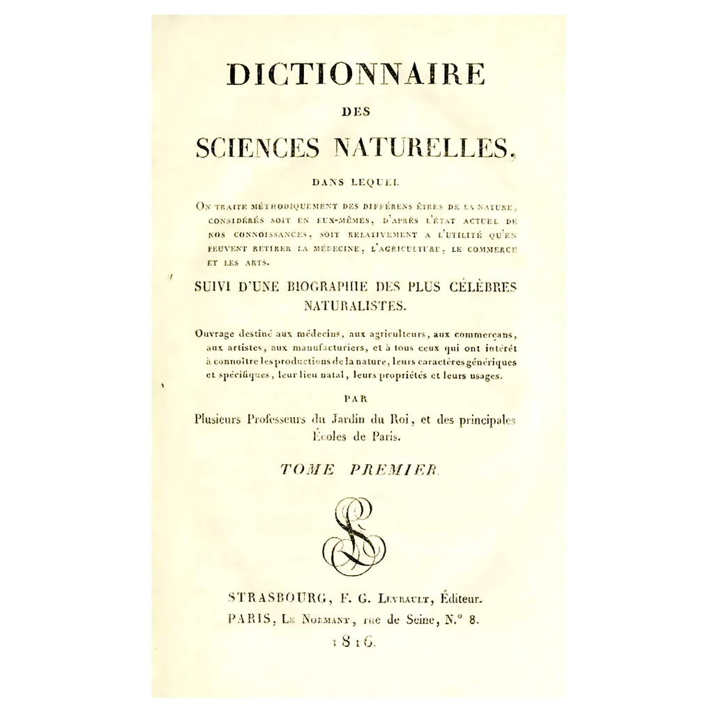 The Dictionnaire des Sciences Naturelles was an epic, comprehensive illustrated work of Natural History, with 72 volumes ultimately published between 1816 and 1830, comprising 60 volumes of text, 11 of plates and 1 of tables. The text was written by the luminaries of science of the time, everyone from Cuvier to Lamarck.